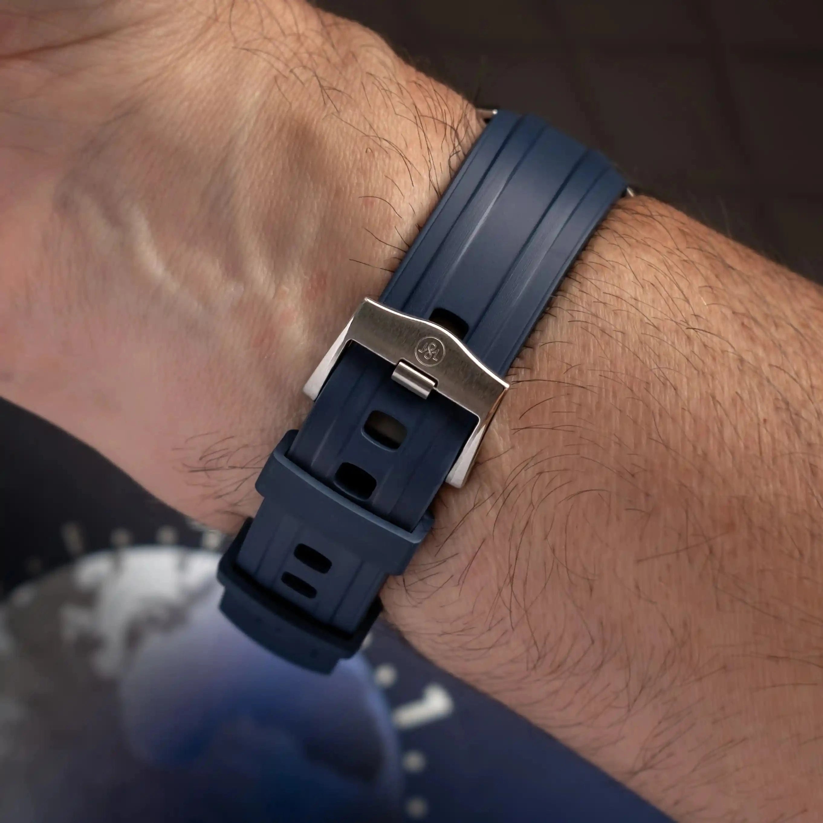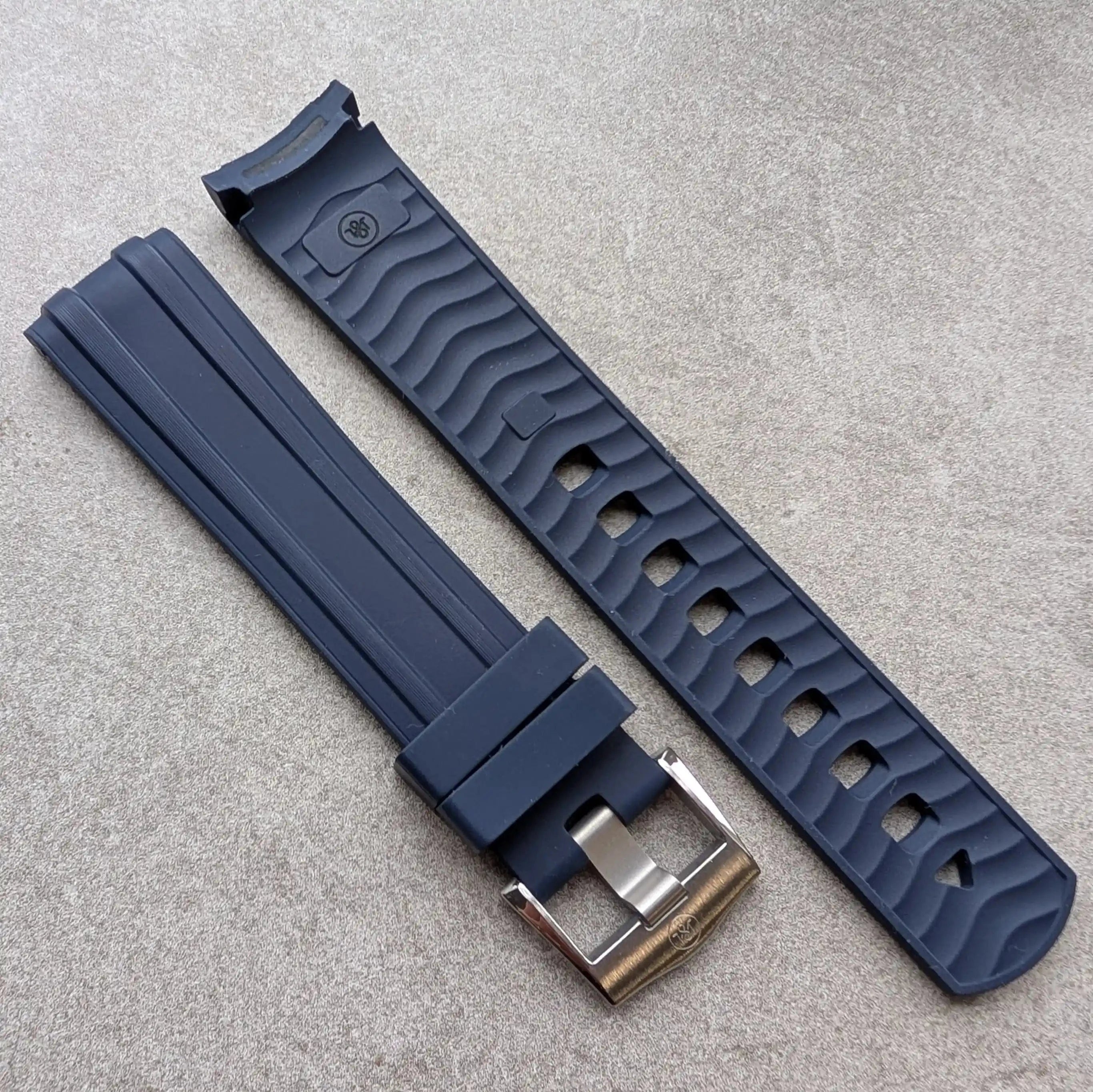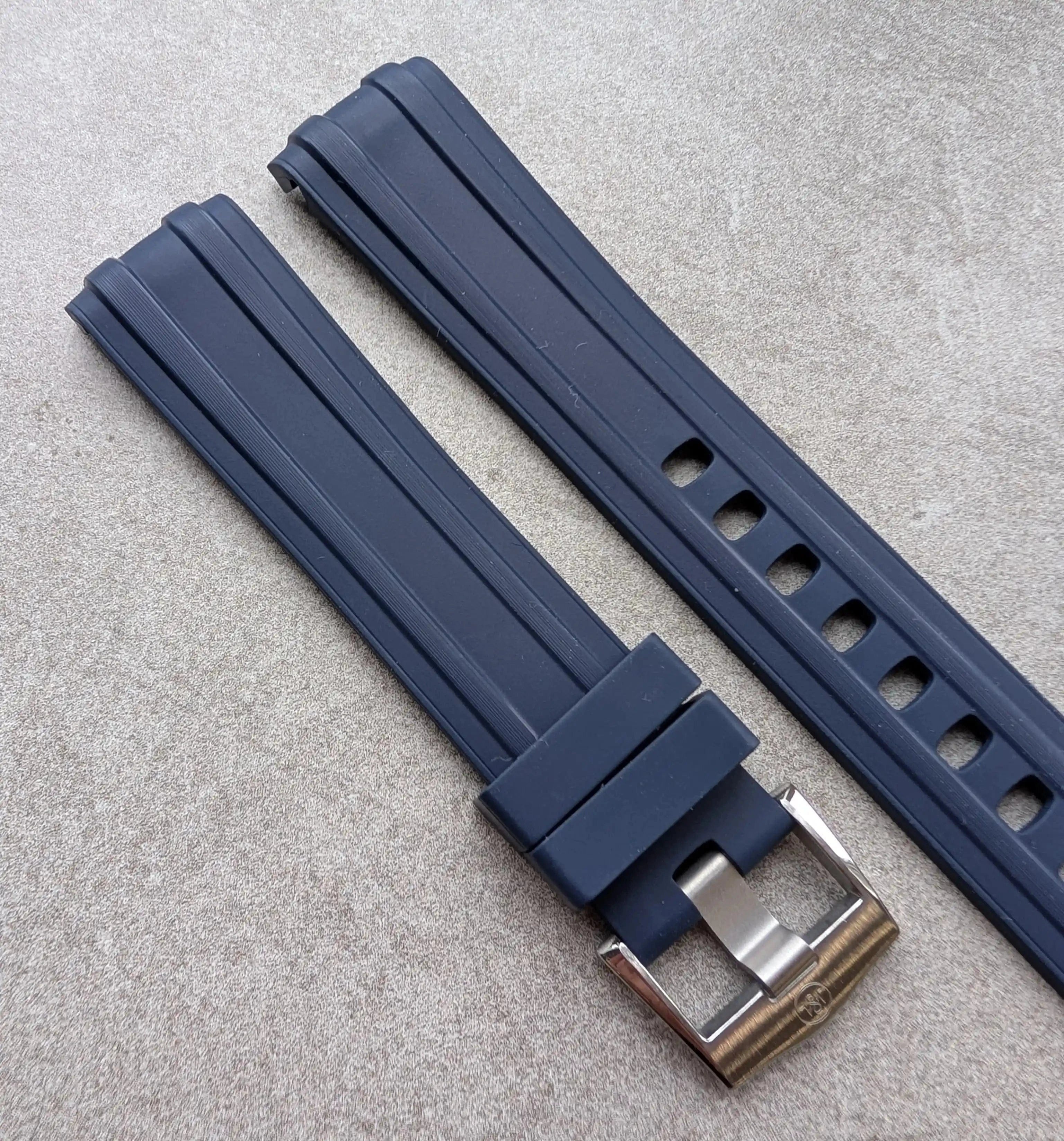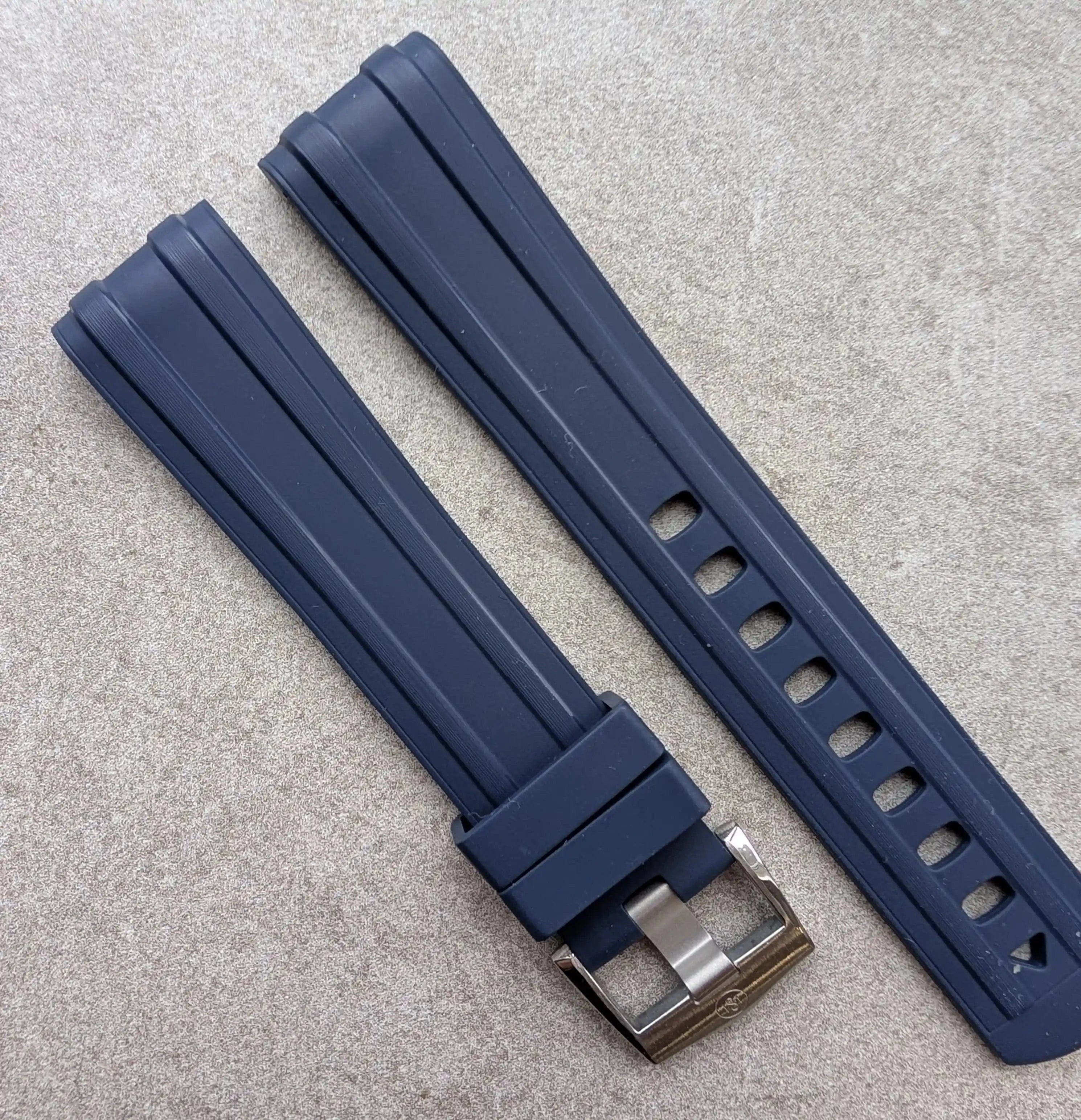 FKM rubber straps are a man-made rubber watch strap with high density but soft to the touch. It was important to me to find a rubber strap that offered ultimate comfort but very good resistance to the elements. FKM rubber can resist extremes of temperature and it is made to withstand harsh conditions such as chemical exposure making this perfect for summer holiday use - the pool, suncream, heat exposure etc. A long lasting rubber strap that is a joy to wear