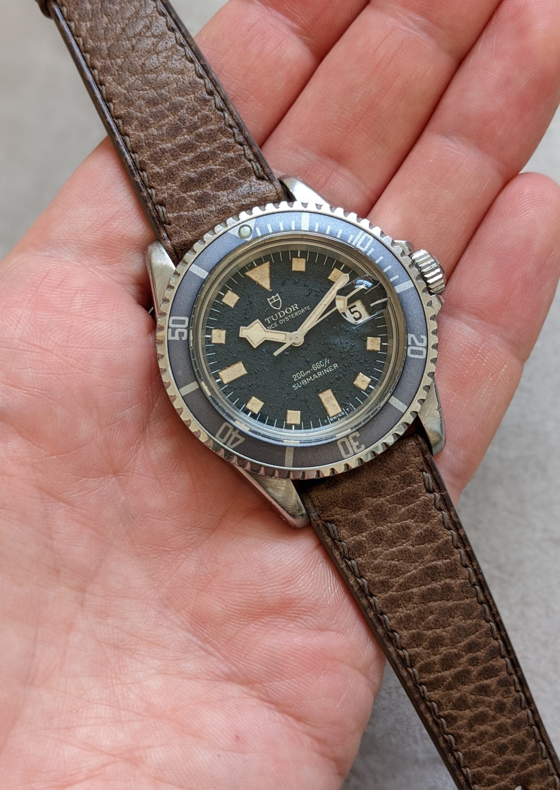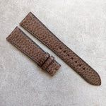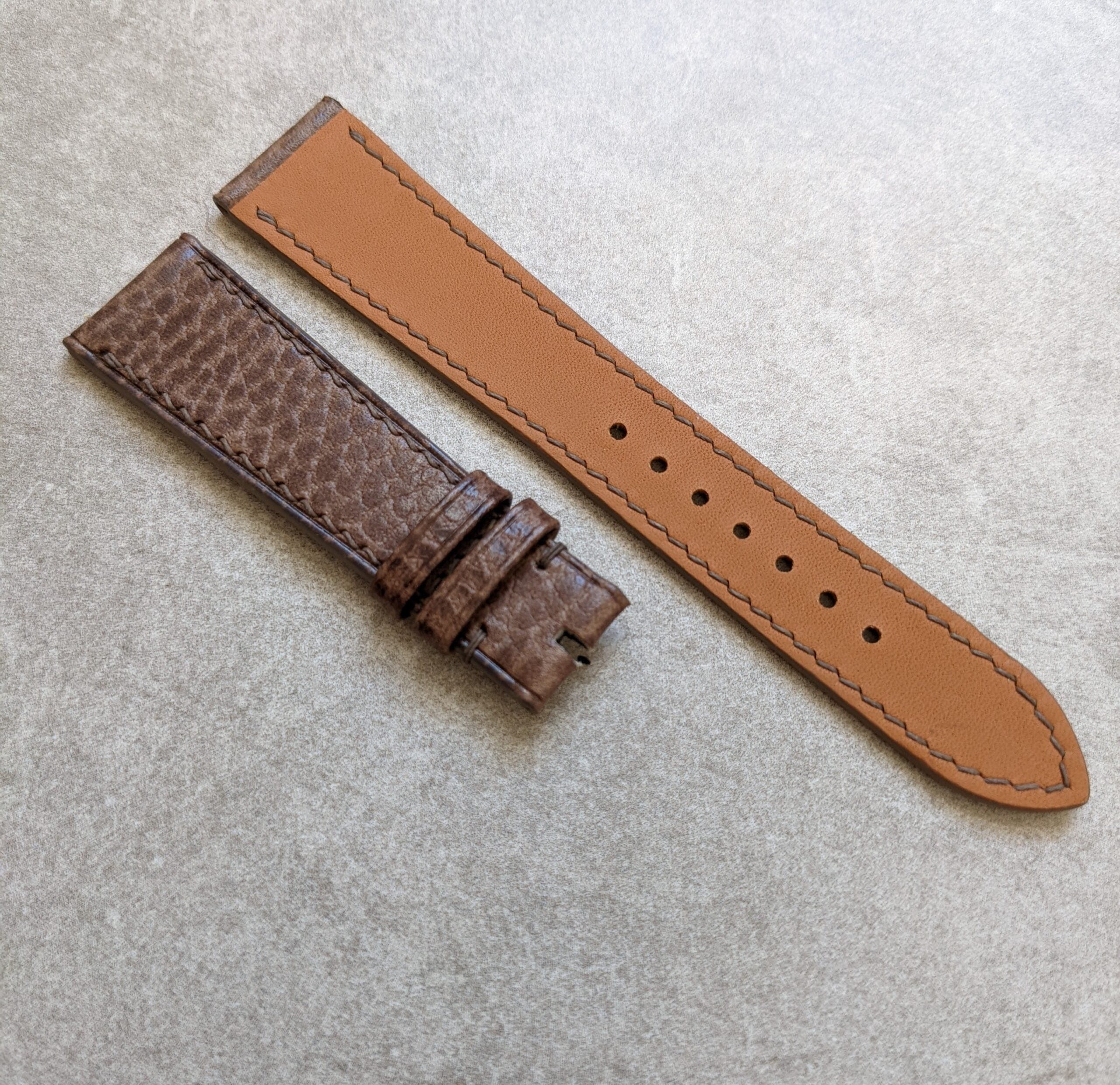 Pebble Grain leather from Walpier Dollaro. A wonderful supple leather with beautiful 'pebbled' texture. A semi-rigid taper gives this strap wonderful structure but also equal comfort on the wrist. Veg tanned in Italy.