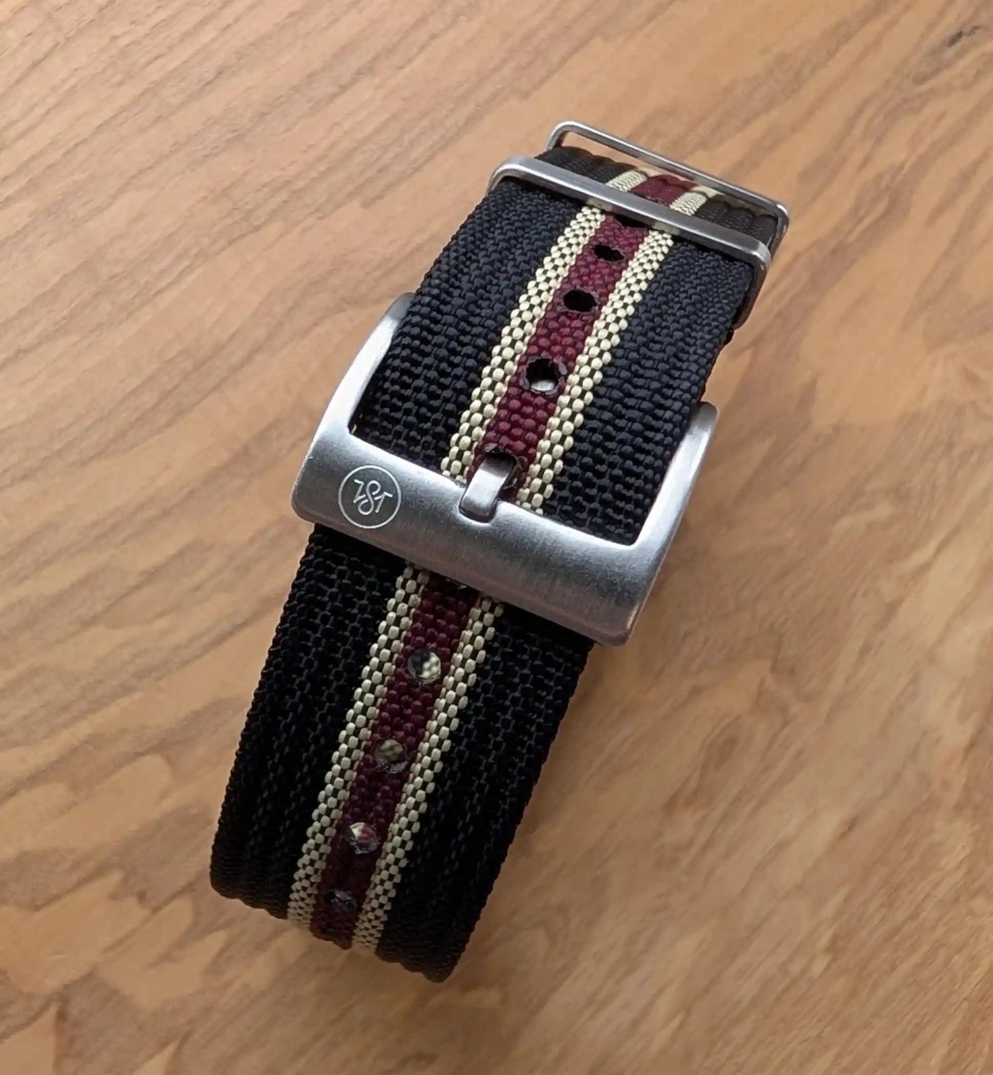 Each of our fabric straps has our branded high quality brushed stainless buckles and keepers. Again, these are the details that seperate low quality fabric straps from ours at The Strap Tailor