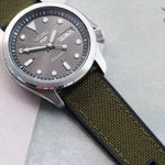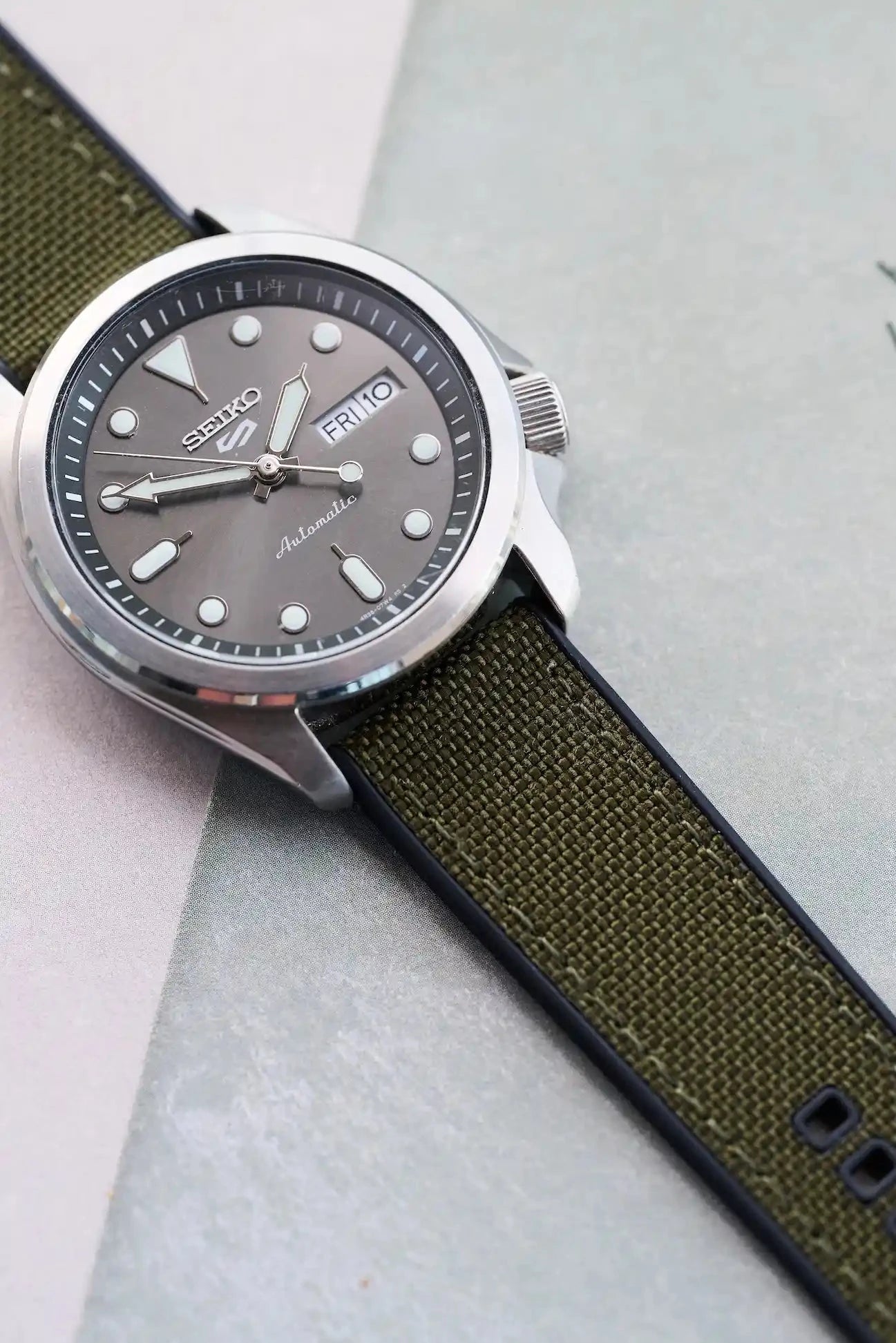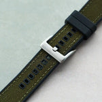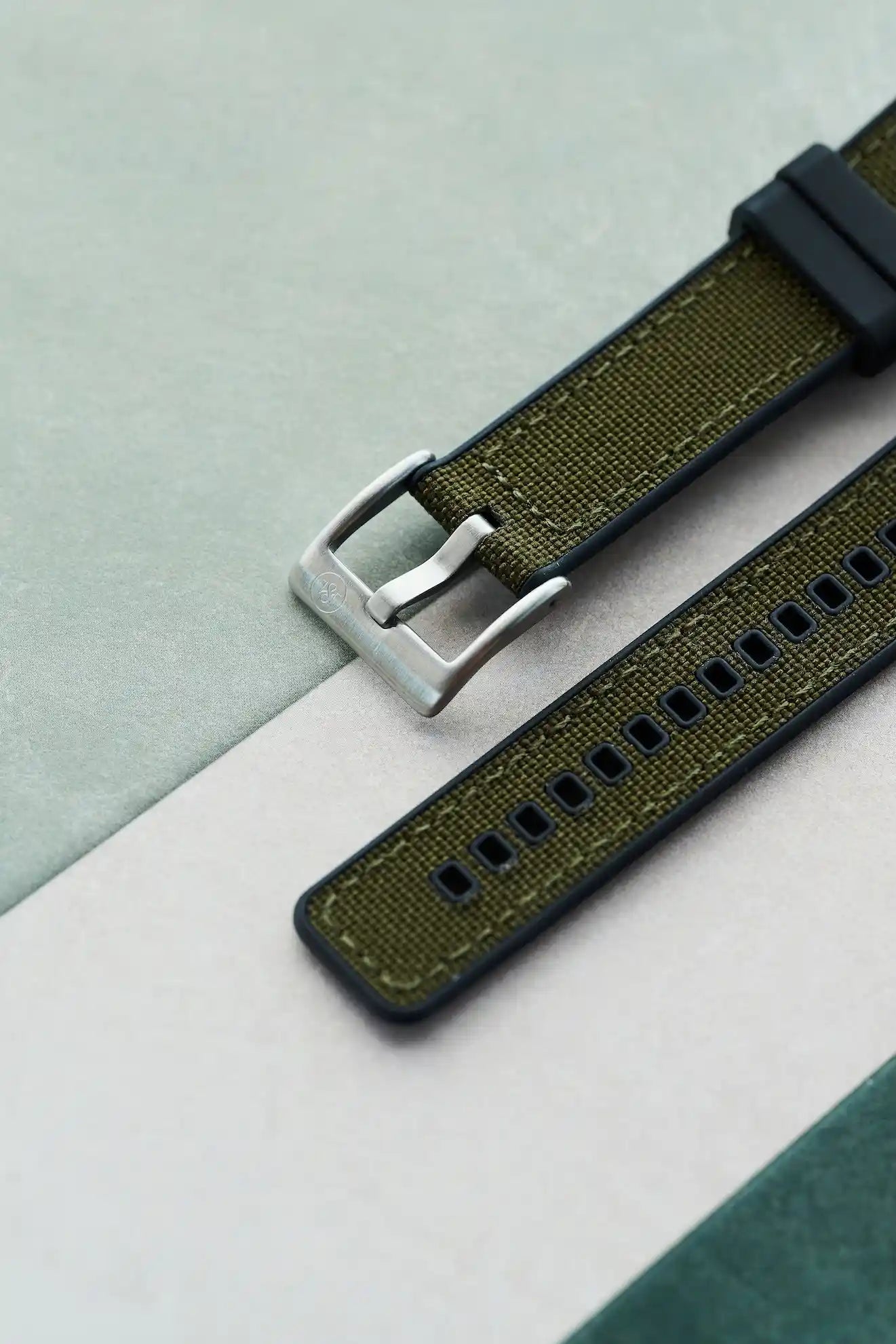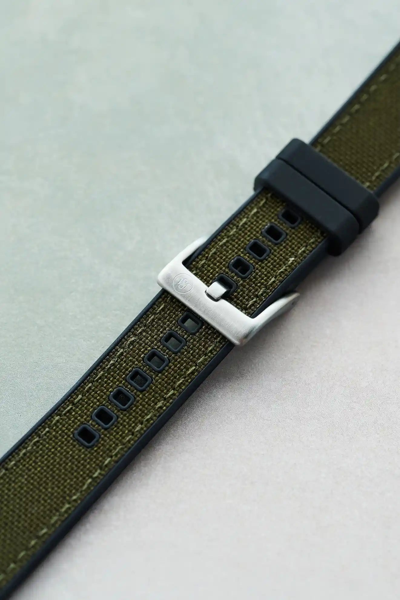 FKM rubber straps are a man-made rubber watch strap with high density but soft to the touch. It was important to me to find a rubber strap that offered ultimate comfort but very good resistance to the elements. Whilst retaining excellent comfort qualities these straps also boast a quality canvas surface for a unique appearance