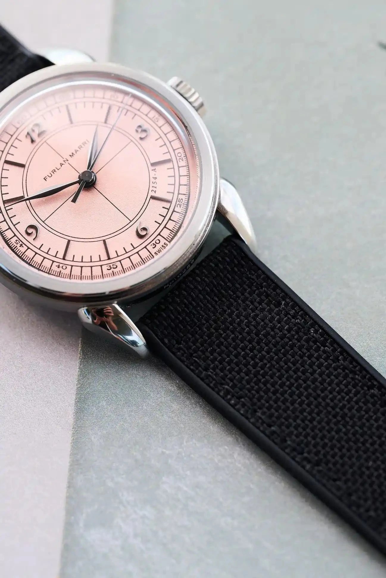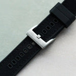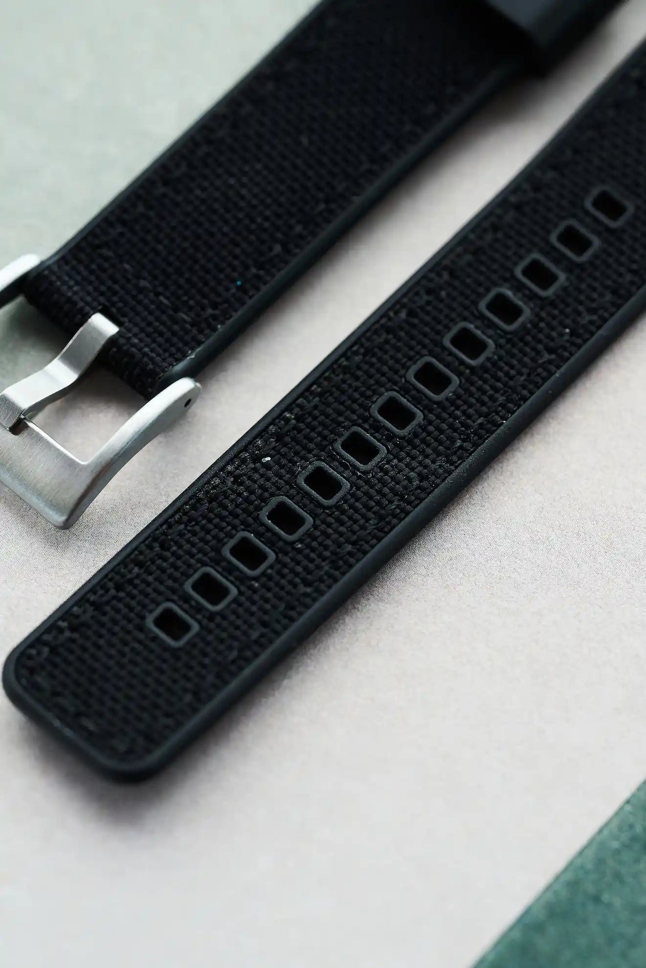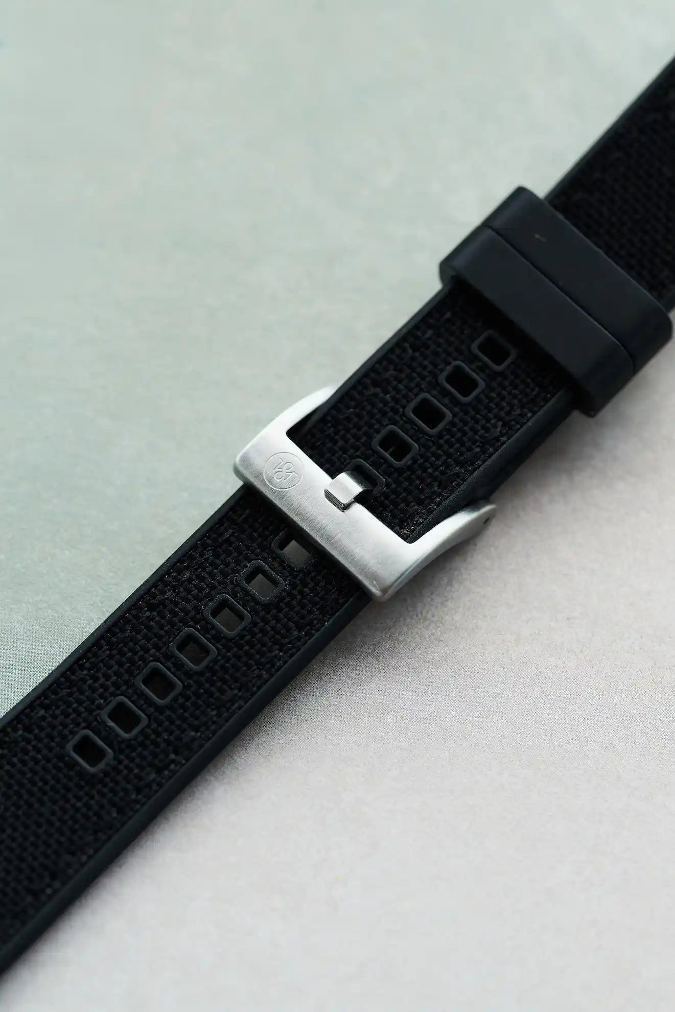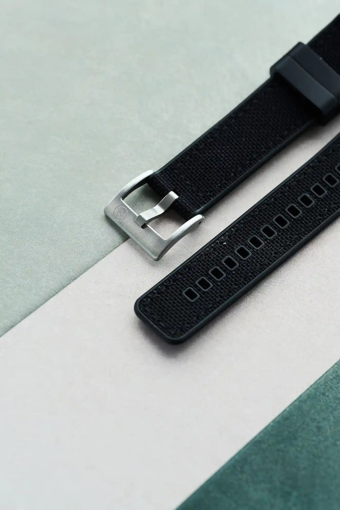 FKM rubber straps are a man-made rubber watch strap with high density but soft to the touch. It was important to me to find a rubber strap that offered ultimate comfort but very good resistance to the elements. Whilst retaining excellent comfort qualities these straps also boast a quality canvas surface for a unique appearance