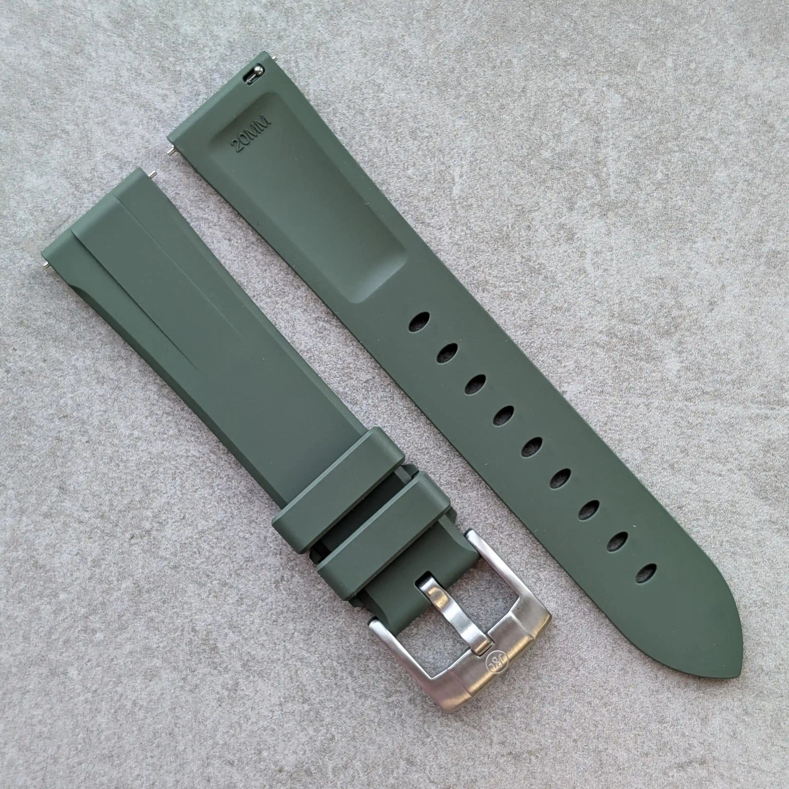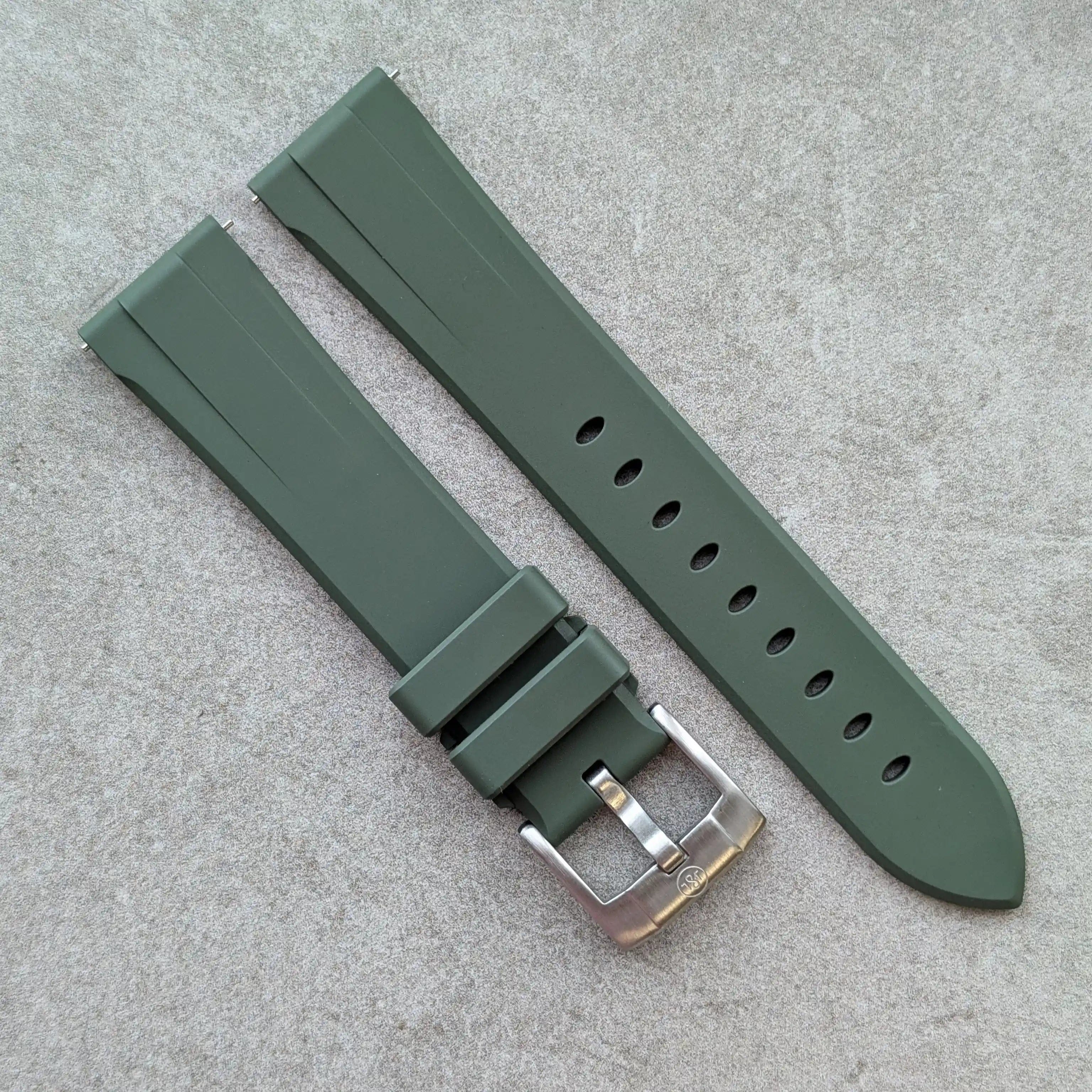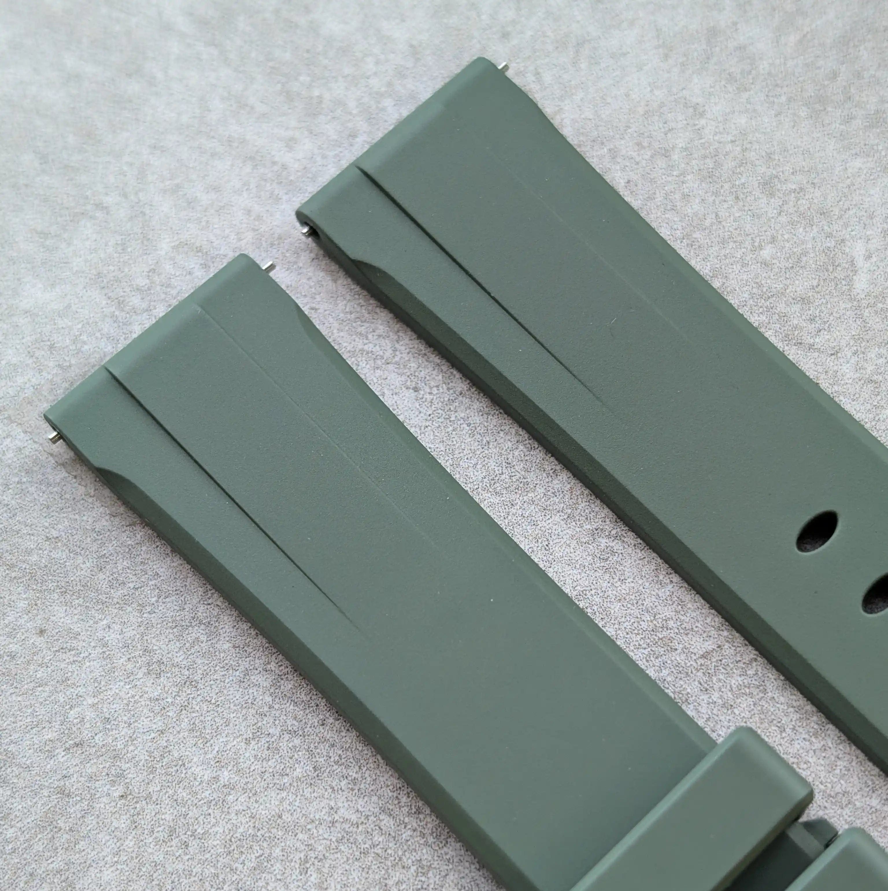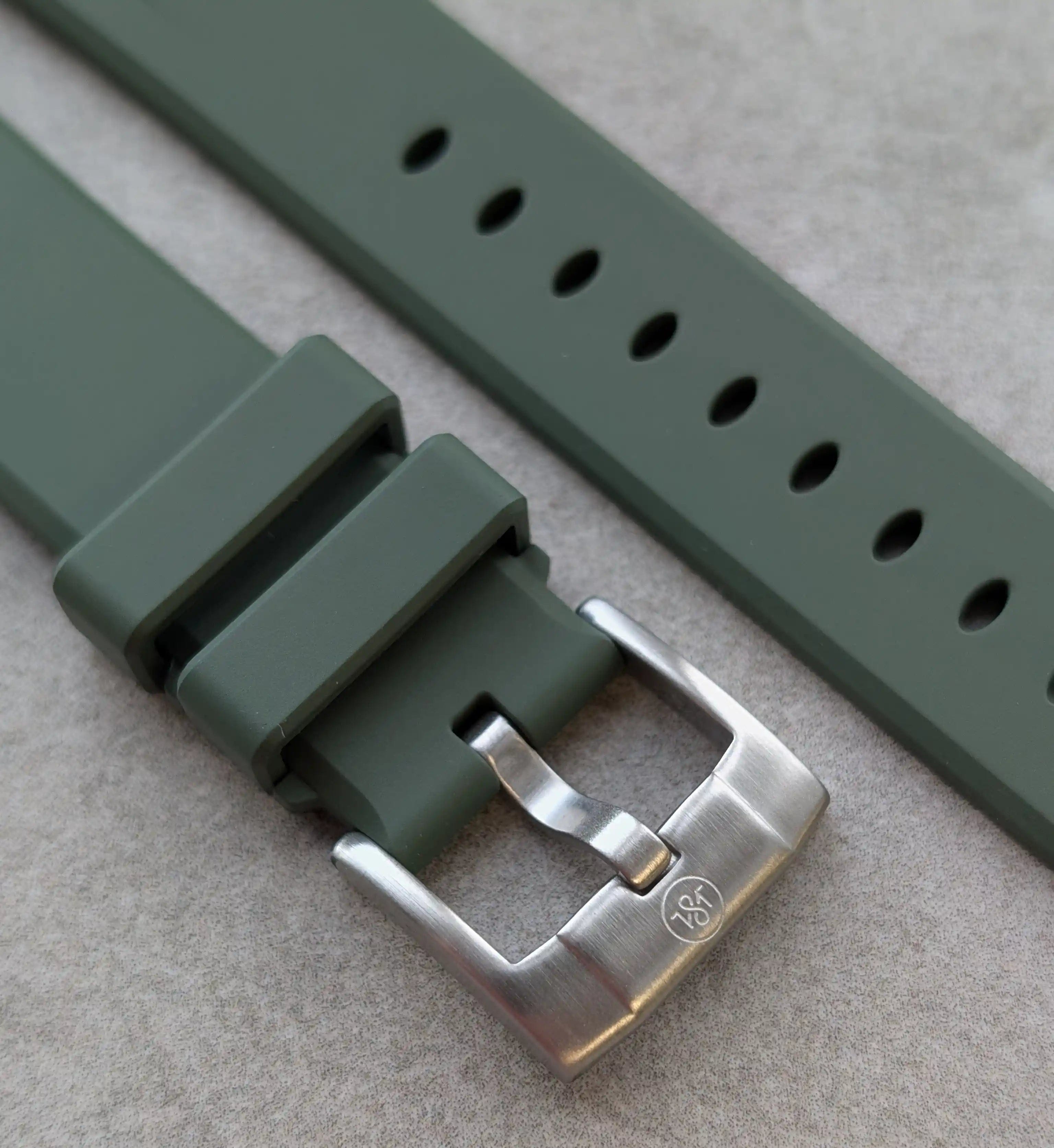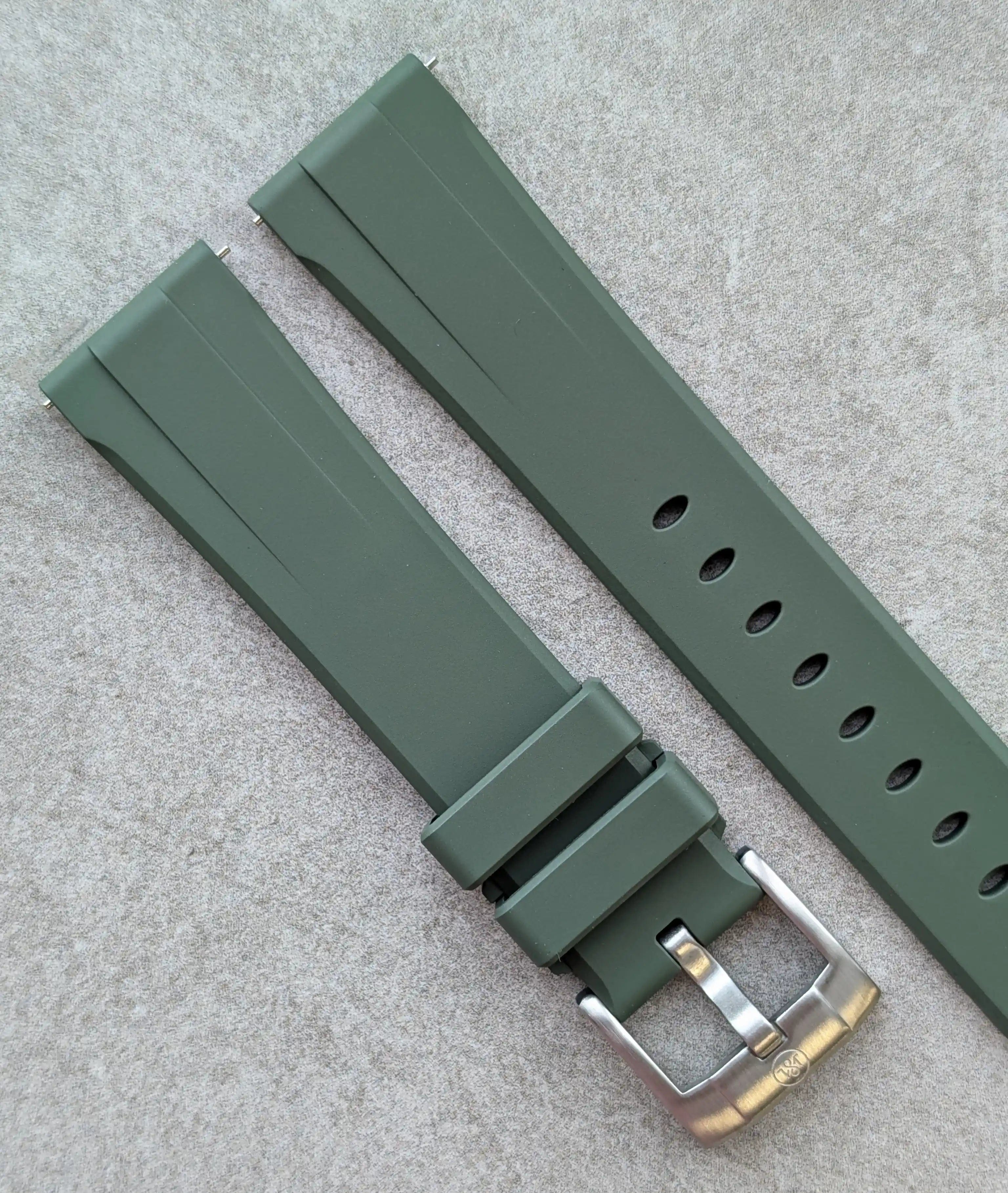 Our FKM rubber watch straps are crafted using only the highest-grade fluoroelastomer compounds, known for their exceptional durability, comfort, and resistance to heat, chemicals, and UV exposure.