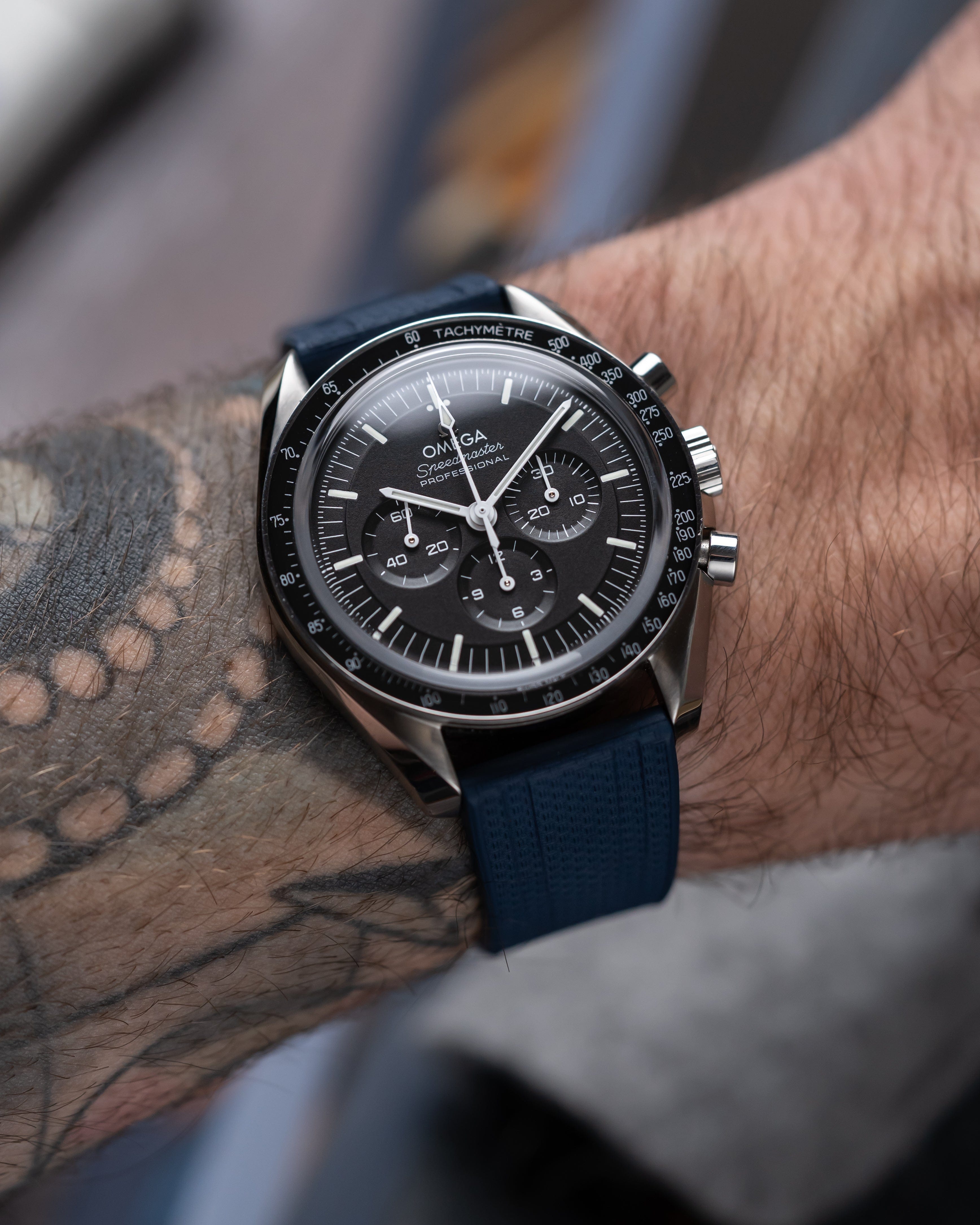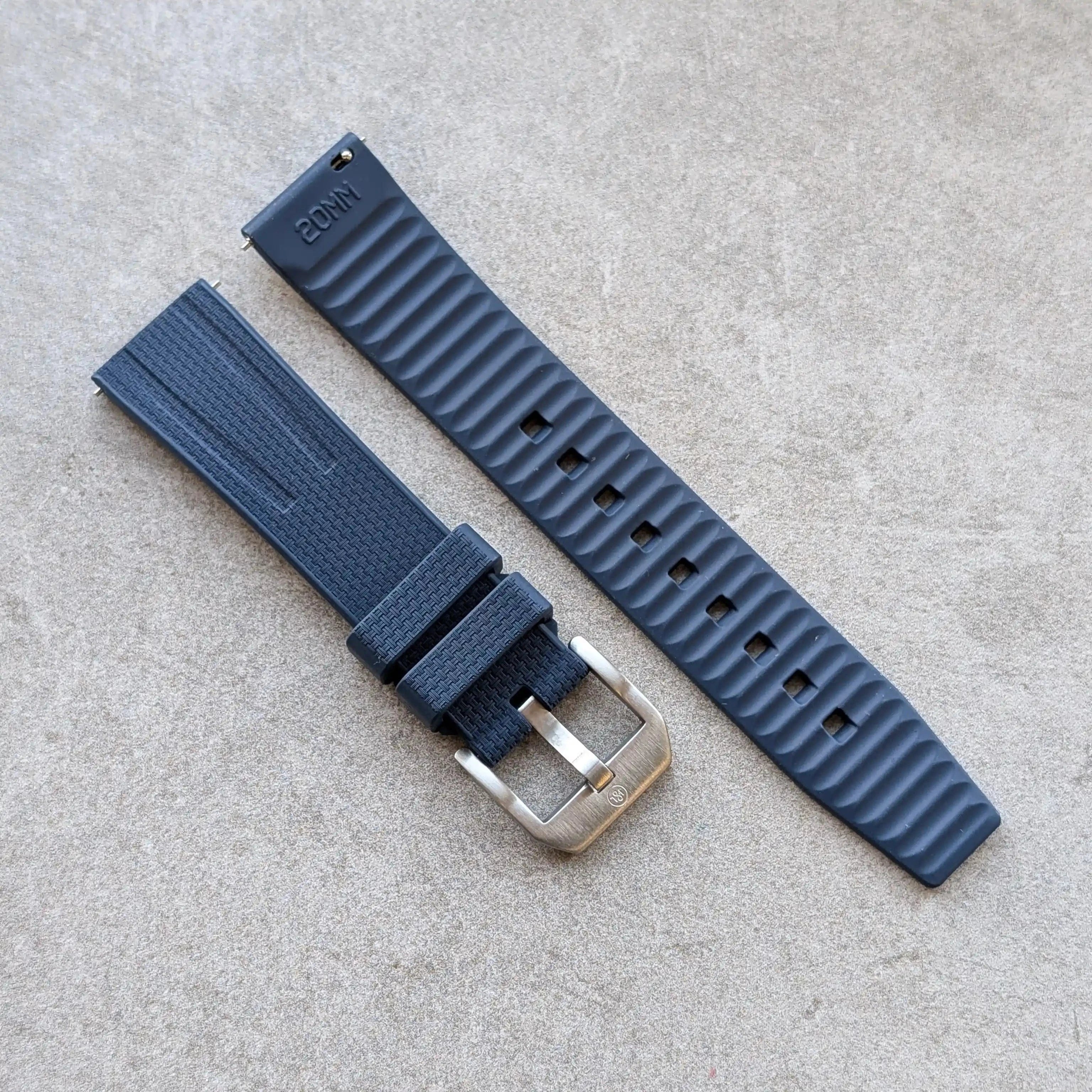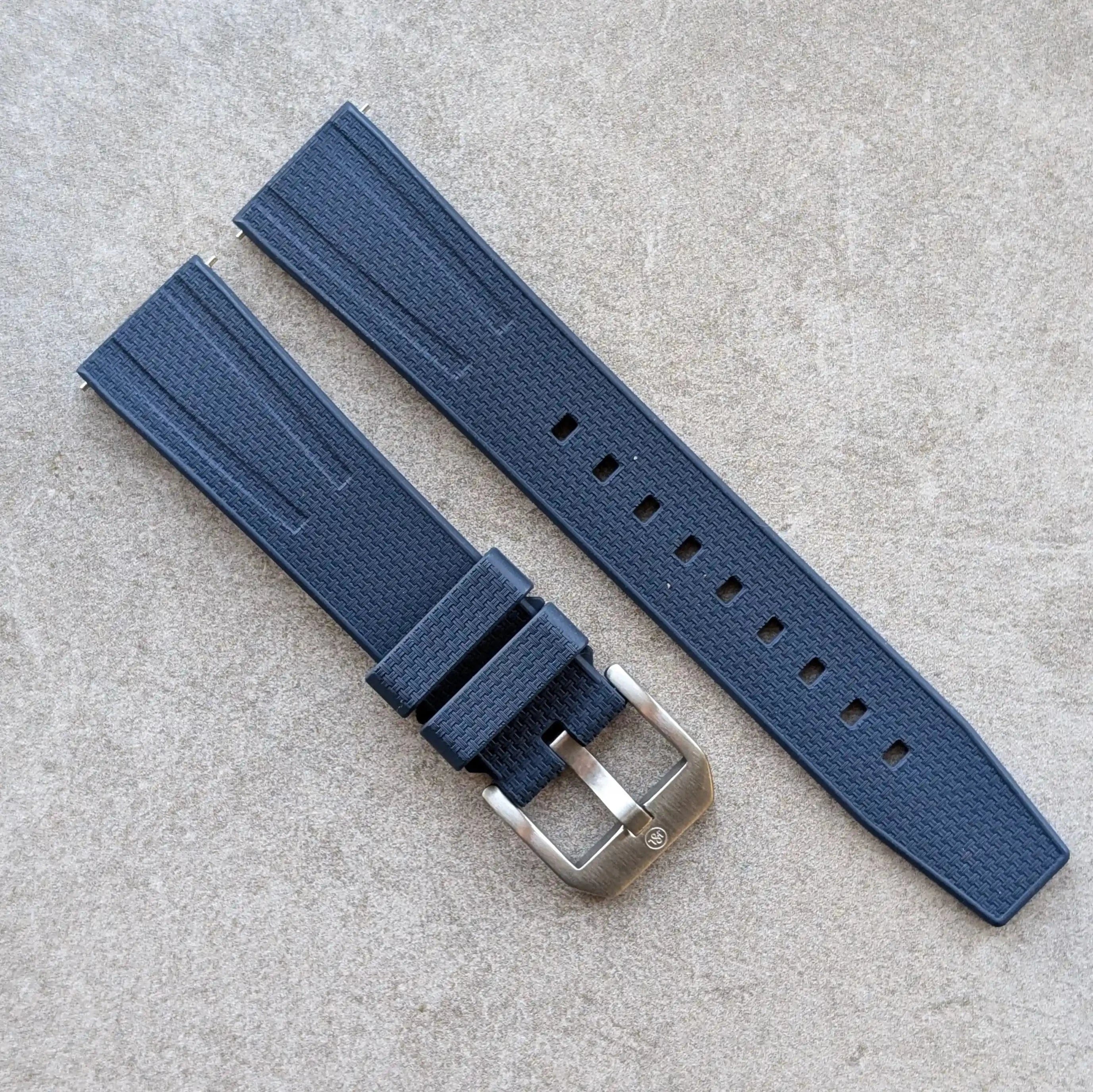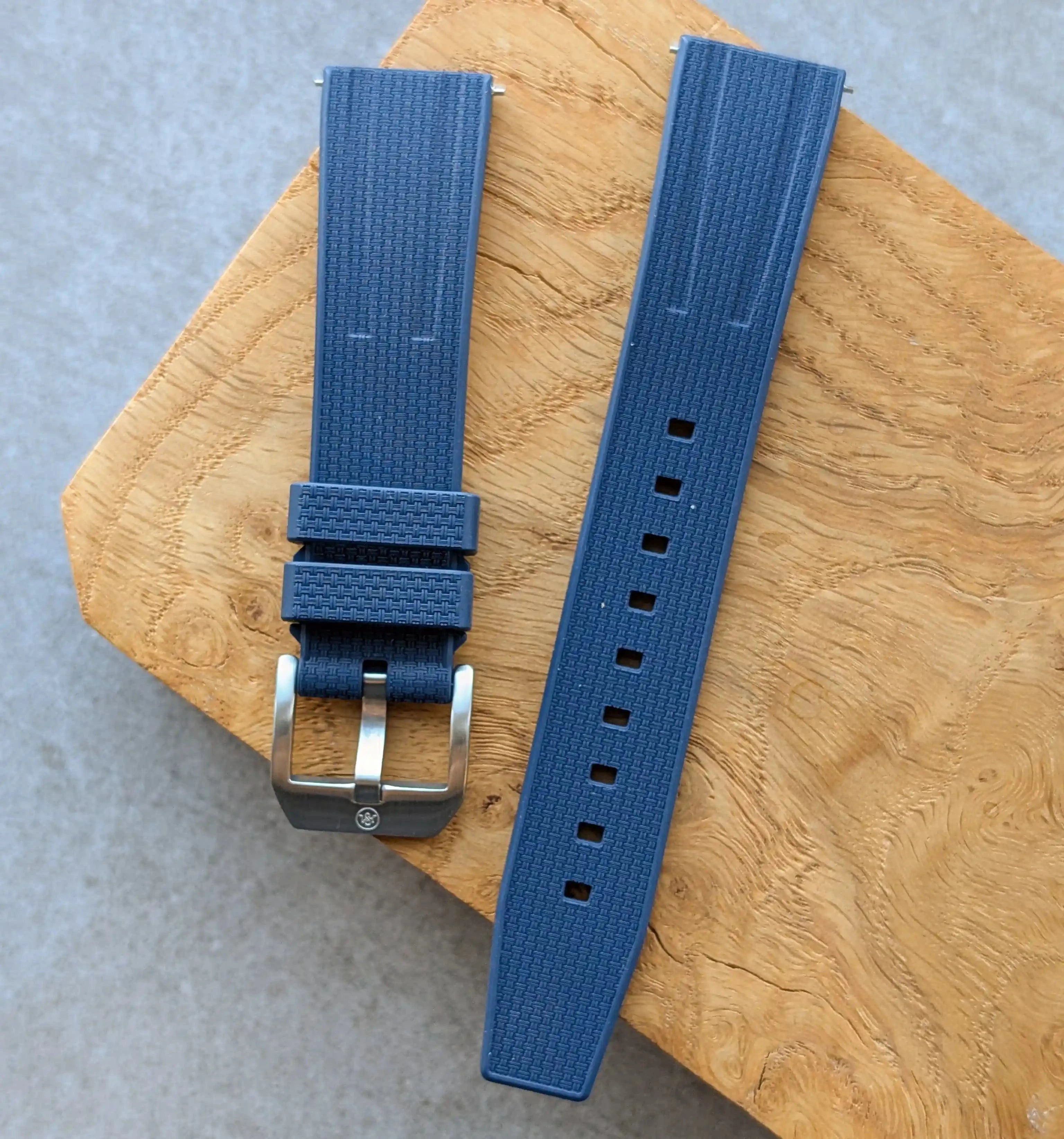 FKM rubber straps are a man-made rubber watch strap with high density but soft to the touch. It was important to me to find a rubber strap that offered ultimate comfort but very good resistance to the elements. FKM rubber can resist extremes of temperature and it is made to withstand harsh conditions such as chemical exposure making this perfect for summer holiday use - the pool, suncream, heat exposure etc. A long lasting rubber strap that is a joy to wear