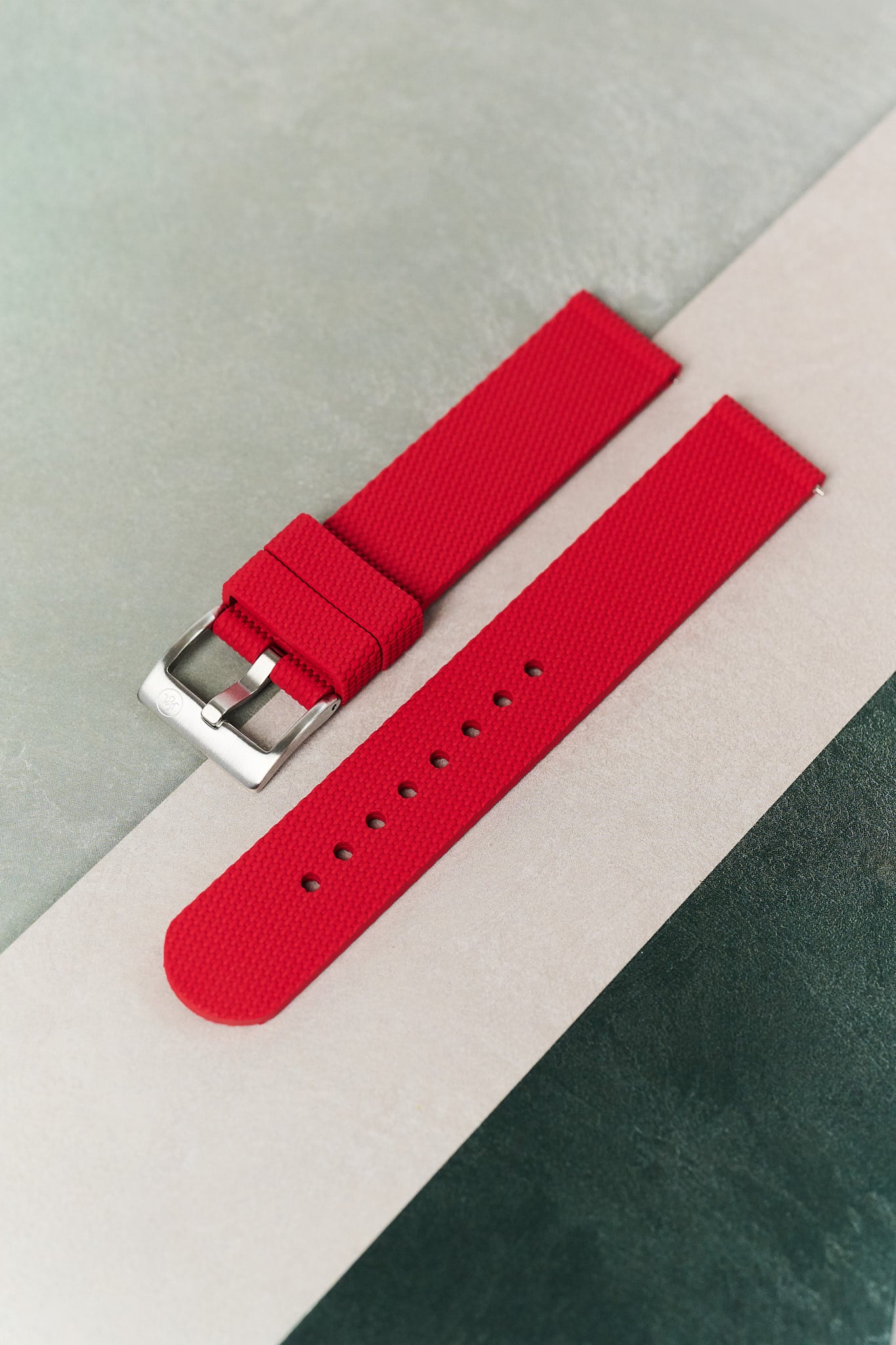 • Brushed stainless steel buckle — Subtle, durable and sympathetic to the strap’s technical character